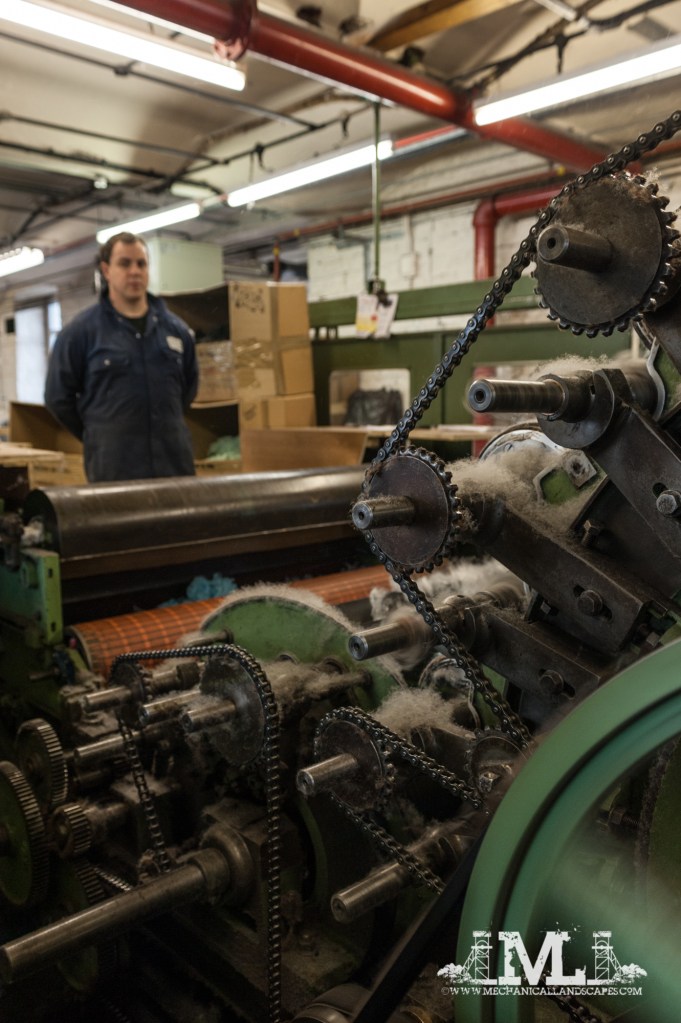 I was approached via my main website (www.theviewfromthenorth.org) by a director of a mill in Huddersfield. They’d bought the old Brook Dyeing site and wanted a set of photos for their archives. I agreed on the proviso that they let me photograph their other, working, mill in Huddersfield. They agreed, and I spent an interesting morning in November with them. Unfortunately there was only a handful of people working that day and only a couple of machines operating, but being interested in anything mechanical, I was more interested seeing it all in action than taking photographs, so I only took about 30. This is a favourite. I used a slow shutter speed to blur the flywheel, and let the camera auto-ISO sort out the ISO settings. I’ve done a spot of curves adjustment to up the contrast, it suits the scene quite well.
