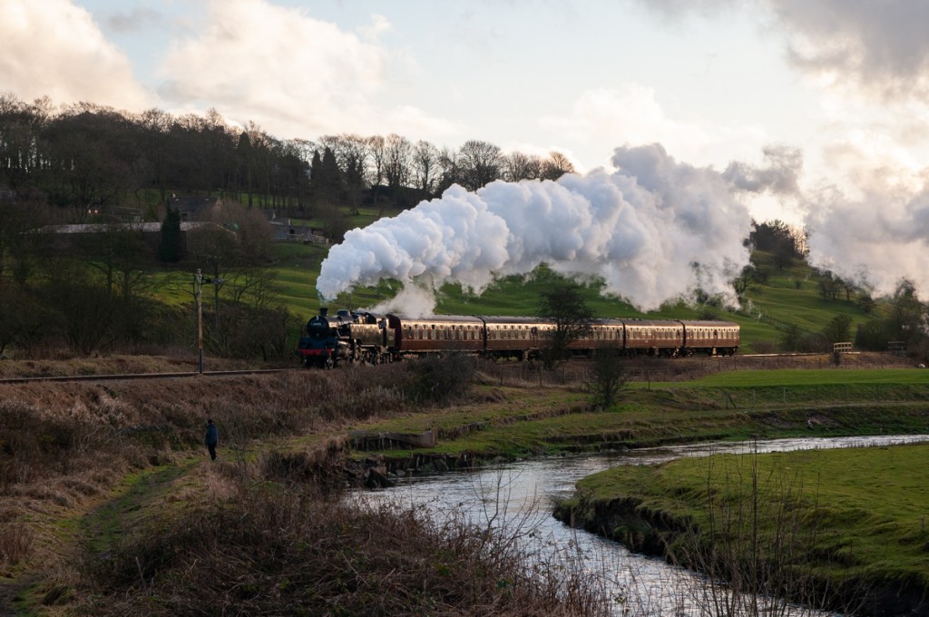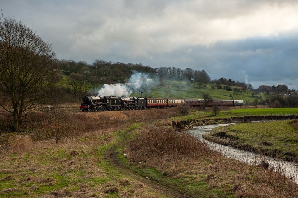 These are taken at Townsendfold on the East Lancs Railway. This first one was taken in 2007 at the winter steam gala, and unfortunately the engines had just backed off and so were not putting much exhaust out (they are approaching a crossing so would need to slow down), but the light was very nice, and a double header is always worth seeing. In retrospect, taking it a few seconds earlier may have given a shot with more steam.
