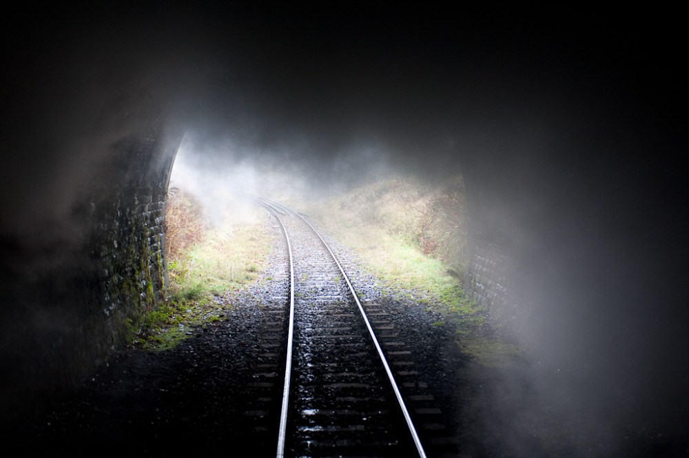 Riding on the rear verandah of the guardsvan gave some different views than you’d get from sitting in a carriage. This is looking back down the line in Brooksbottom Tunnel.