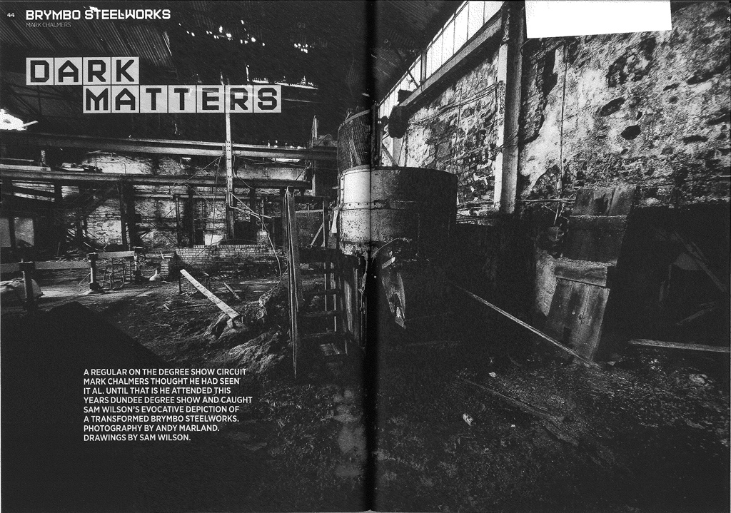 I correspond every now again with Mark Chalmers who shares an interest in urban exploration, and he recently asked me if he could use some photos from Brymbo Steelworks to illustrate an article he was writing for Urban Realm magazine . The article is a feature on a final year MA architecture project based on a theoretical redevelopment at Brymbo, and as he’d not been himself, he asked if he could use a couple of my pics.