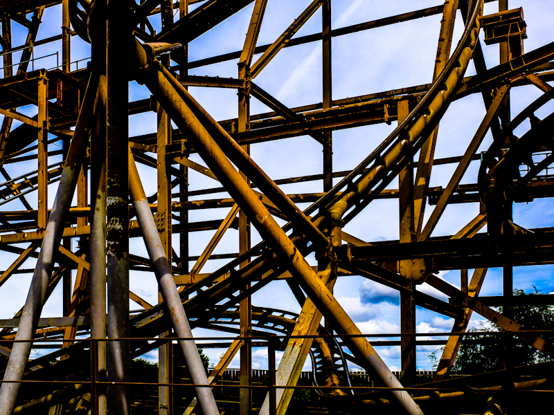 By leaving the composition uncropped, I’ve deliberately left it slightly unbalanced to create tension. The dominant feature is the girder on the left with the diagonal girders radiating out of it, but the curve sweeping up towards the top right hand corner helps to balance it out. This could manage a crop to the right hand side so that the curve finishes right in the corner, but there would be elements jutting into the frame that would be distracting. In retrospect, I should have framed it with a little more care.