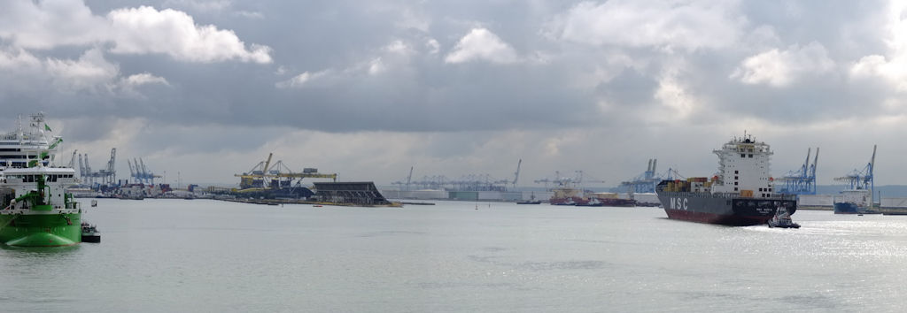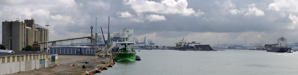 The top photo benefits from a crop (below), as the ship on the right helps to balance the bulky grain elevators on the left, while the ship in the middle gives the eye something to look at as it passs through the image from left to right, and I guess the splash of green on the hull helps.
