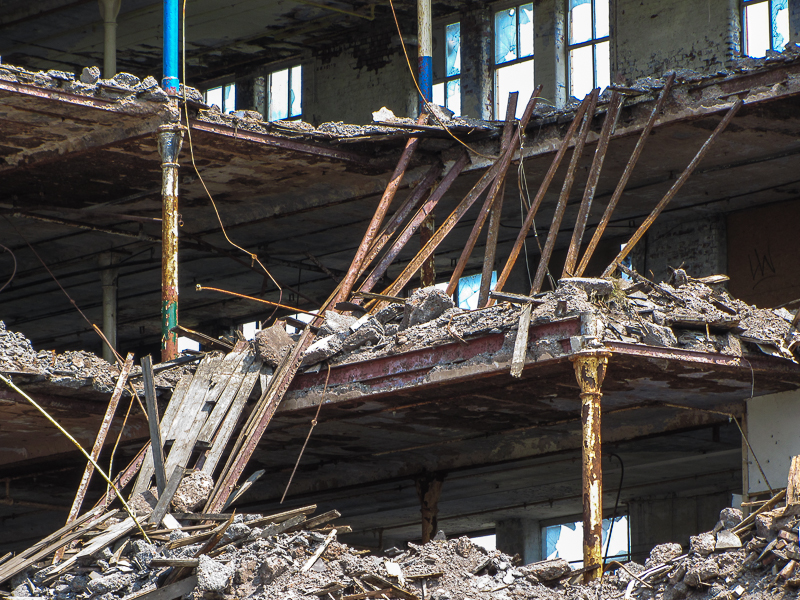 Seeing the partly demolished mill reminded me of a gym I used to go to in the early 90’s in Mossfield Mill in Bolton. One half of the mill had been demolished, and left open to the elements, while the gym and a couple of other businesses continued to operate as normal in what I think was the cotton store attached to the other end. The doors off the well worn staircase to the top floor were normally locked shut, but occasionally were open, affording a surreal view of the Bolton townscape beyond the empty mill floor.