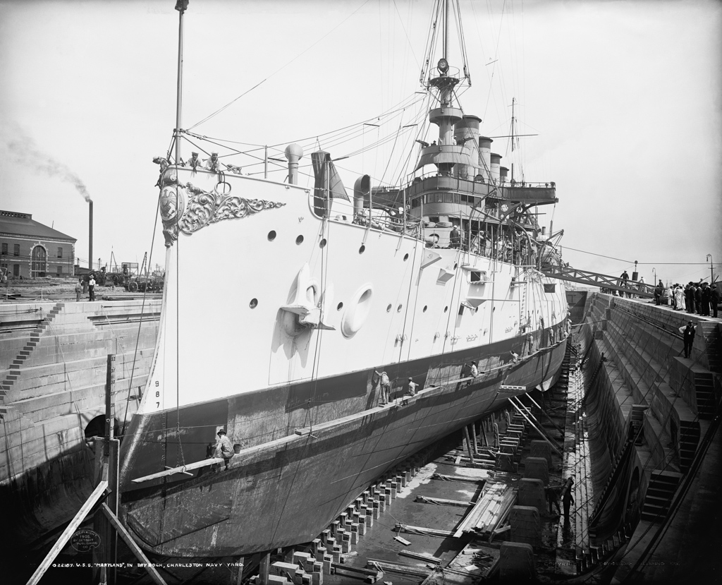 This late 1890’s / early 1900’s type of battleship were known as pre-Dreadnoughts, as they were all made obsolete when the Britishnlaunched the HMS Dreadnought in 1908. You’ll notice the characteristic sloped bow – these were standard for the era and early ships had them reinforced for ramming, which was considered an important tactic / weapon of the era. However, it ultimately fell out of vogue as in reality ships rarely got close enough to each other to engage, mainly thanks to improvements in naval gunnery.