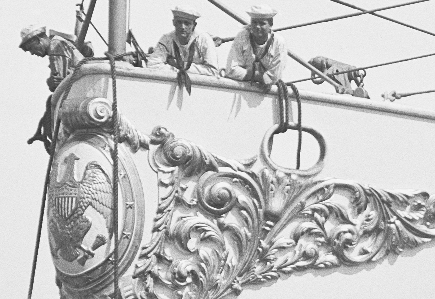 This is a really busy scene. The initial thing you I saw was the team of men painting the ship, and then the men on the bow looking at the camera. There seems to be some kind of re-supply operation going on with a line running from the dockside fo the ship that has a container running along it. There is a good crowd of bowler hatted people on the dock observing the activities. Up on the mast on the superstructure, two sailors are doing something, maybe cleaning the smaller guns.