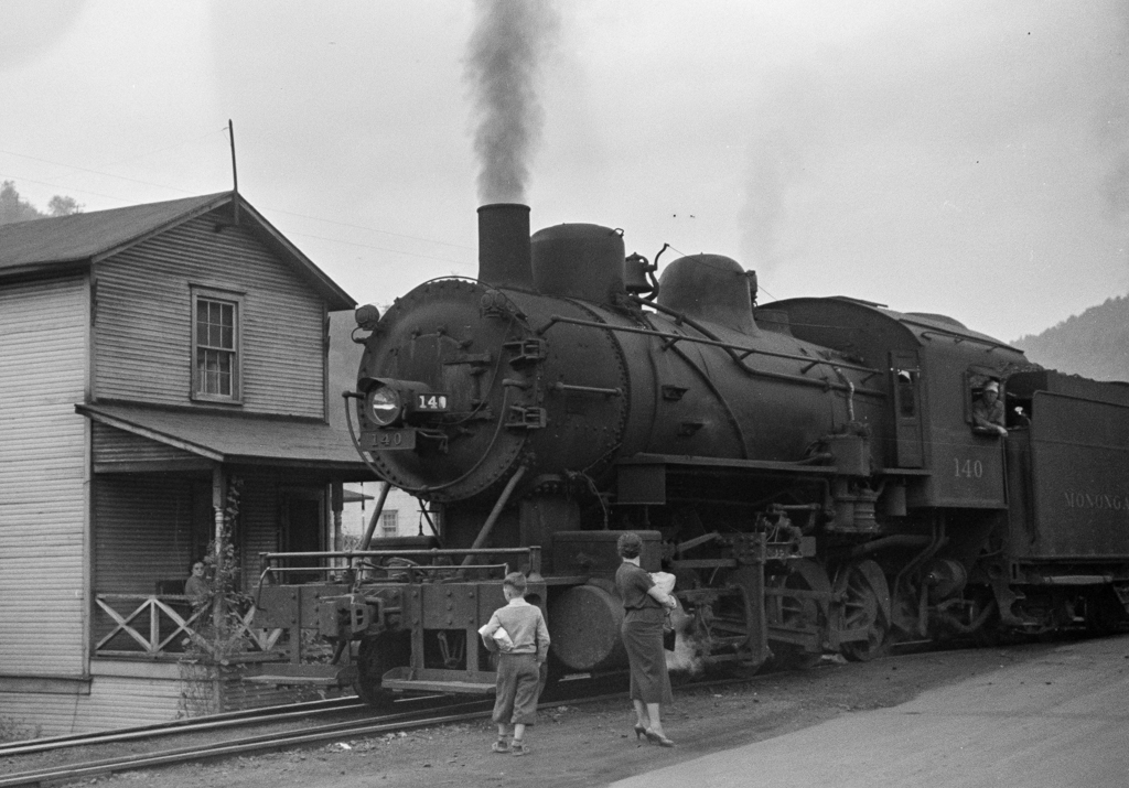 Train pulls coal through center of town past miners’ homes (company houses) several times morning and evening. Osage, West Virginia.