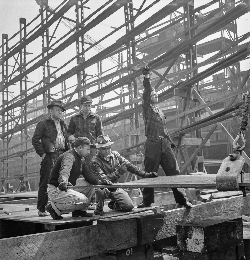 Bethlehem-Fairfield shipyards, Baltimore, Maryland. Erecting a flat keel.