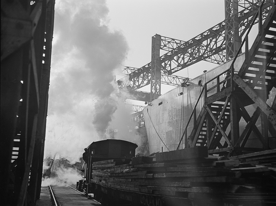 Between the ways of this large Eastern shipyard run tracks for flat cars carrying materials or sections to be hoisted onto the decks of ships under construction.