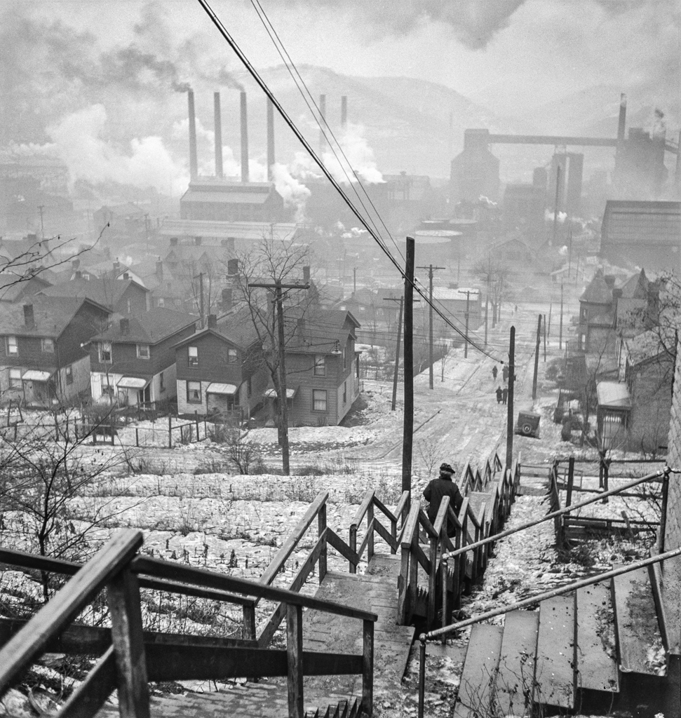 There are a few different variations of this scene on the Library of Congress website, but this one just works best in my eyes. Maybe it’s the solitary figure walking done the steep icy steps, and the people further down, all heading towards the gargantuan steel mills that dominate the bottom of the valley.