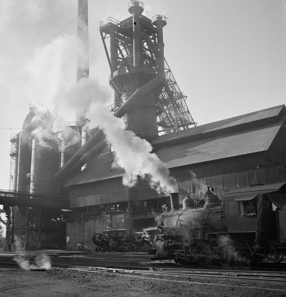 This photo is titled ‘Columbia Steel Company at Ironton, Utah a locomotive outside the blast furnace’.