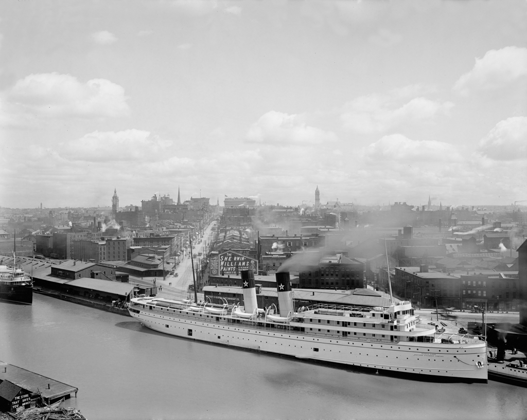 The steamer is Northland, one that appears in a lot of photographs in the the Library of Congress archive. It was one of many steamers that worked on the Great Lakes. Their purpose was either to link railheads on either side of the lake or to carry tourists to the more remote areas that were all but inaccessible before cars became more available post world war 2.