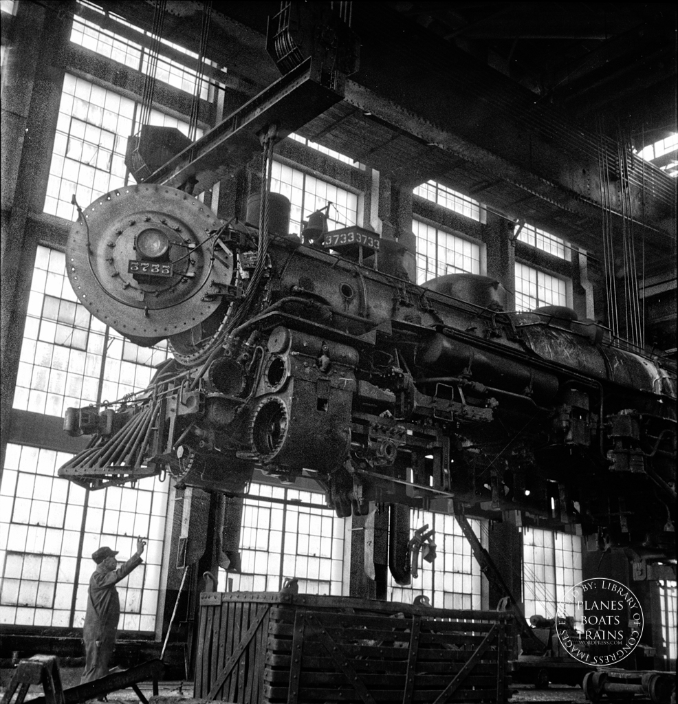 Title: Albuquerque, New Mexico. Lifting an engine to be carried to another part of the Atchison, Topeka and Santa Fe Railroad shops for wheeling