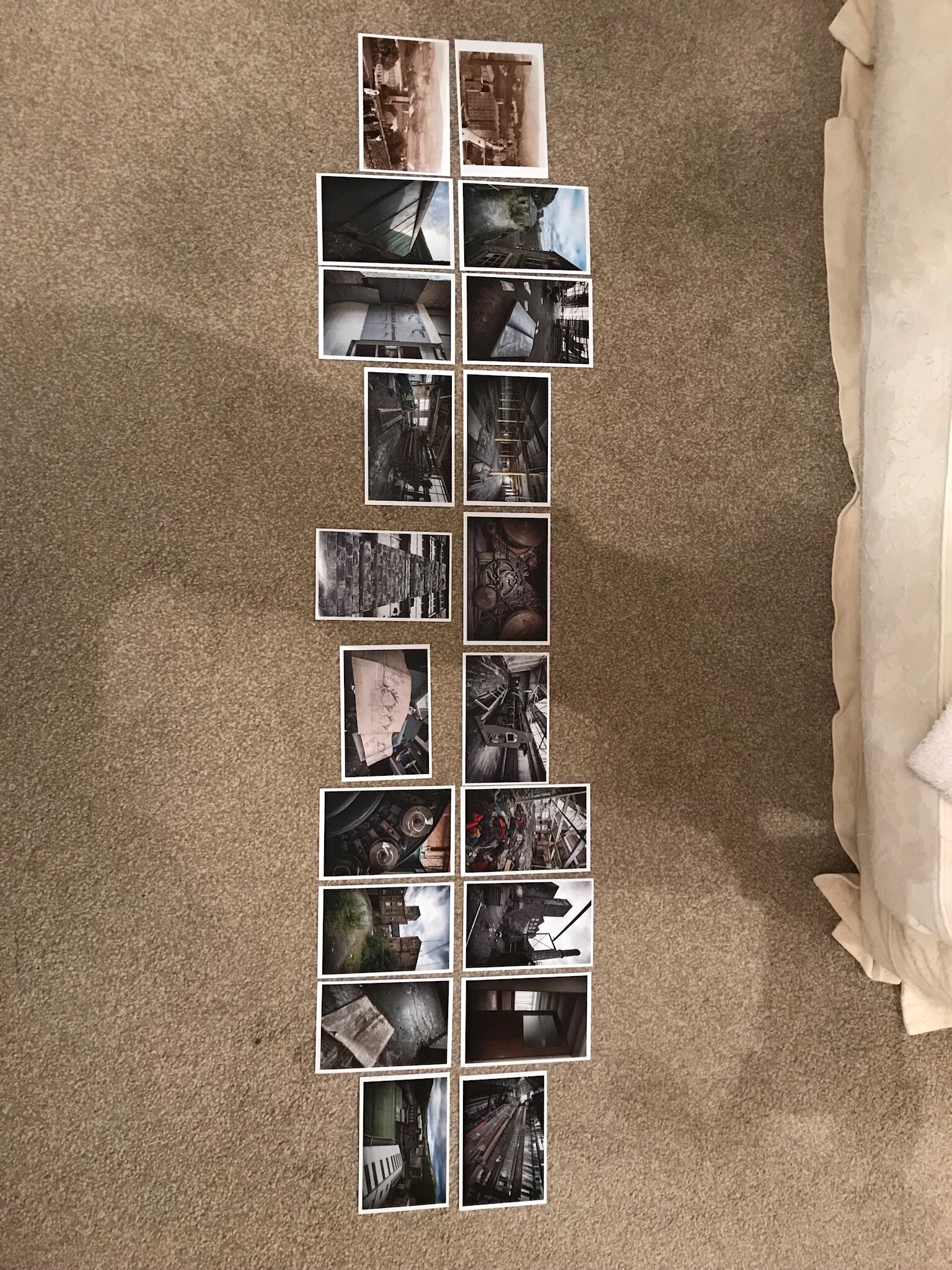 What I always do when laying out any portfolio, book or exhibition, is to get a load of small prints and spread them out on the floor. I can then see the visual relationships between not only adjacent images, but also as a whole. One wall is a clear flat wall and this is where I displayed the 20 images in the ‘original’ frames. The other wall is interrupted by two pillars, however this does allow for natural breaks and was thus the logical place to have a mix of larger and smaller images.