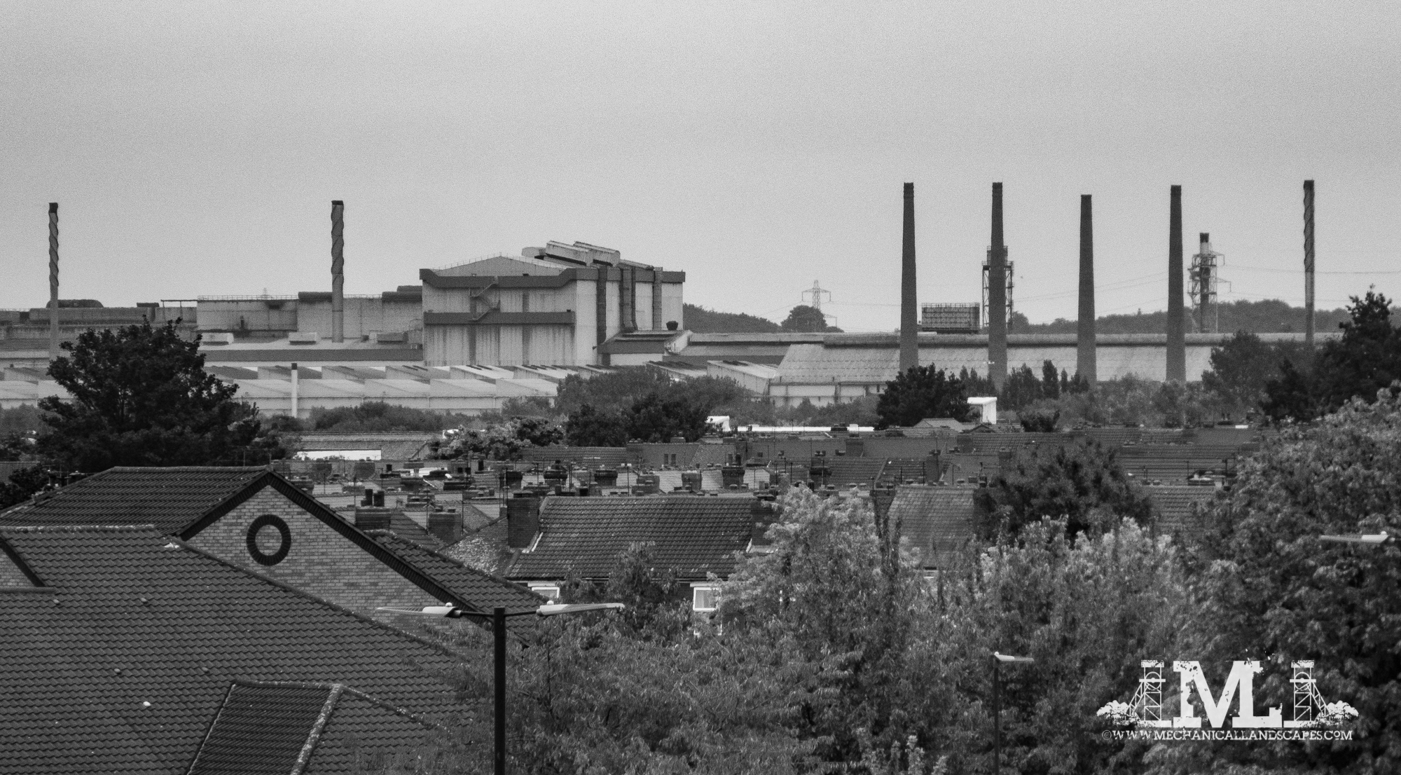 This limitation extended to the ability to compose and I’m not entirely happy with any of the photographs that I took, but I’m not sure I could do any better in the circumstances. Still, that’s all I’ve got, so until I can go and explore the town further, I’ve been exploring different crops. The key components I wanted were the rooftops and the steel mill in the background, a composition used by photographers such as Walker Evans and Bernd and Hilla Becher in a number of photographs. But this scene lacks a focal point, so although I wanted a panoramic crop, I opted to gave it a little more height to give more foreground and a little more depth.