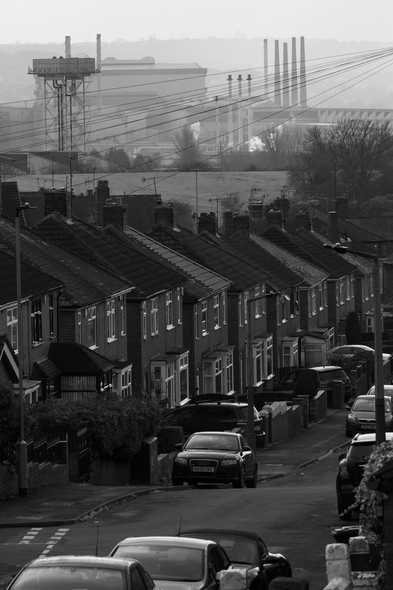 My last visit to Rotherham was unproductive and I didn’t have the time to explore the area, but I was determined to take a photograph that captured the steelworks in the urban landscape. The idea for the composition of the photograph came from one I found on Getty Images, when I was researching possible locations for photographing the steelworks. It’s not the easiest of places to photograph, being mainly a collection of huge steel sheds and chimneys so I looked at what other photographers had done. When I found this, I knew instantly that this was the scene I wanted to capture, although pinpointing the exact location took a long time as I’m not from the area and had to make extensive use of Google Earth and Google Streetview. Having been an admirer of Delano’s photograph for some time (I wrote about it here a few years ago), I could instantly see the parallels. So mine is a contemporary British interpretation of it – the semi-detached houses, the cars for driving to work rather than walking, and the smoke-free works at the bottom of the valley. The telephone wires are still there though, but going in a different direction.