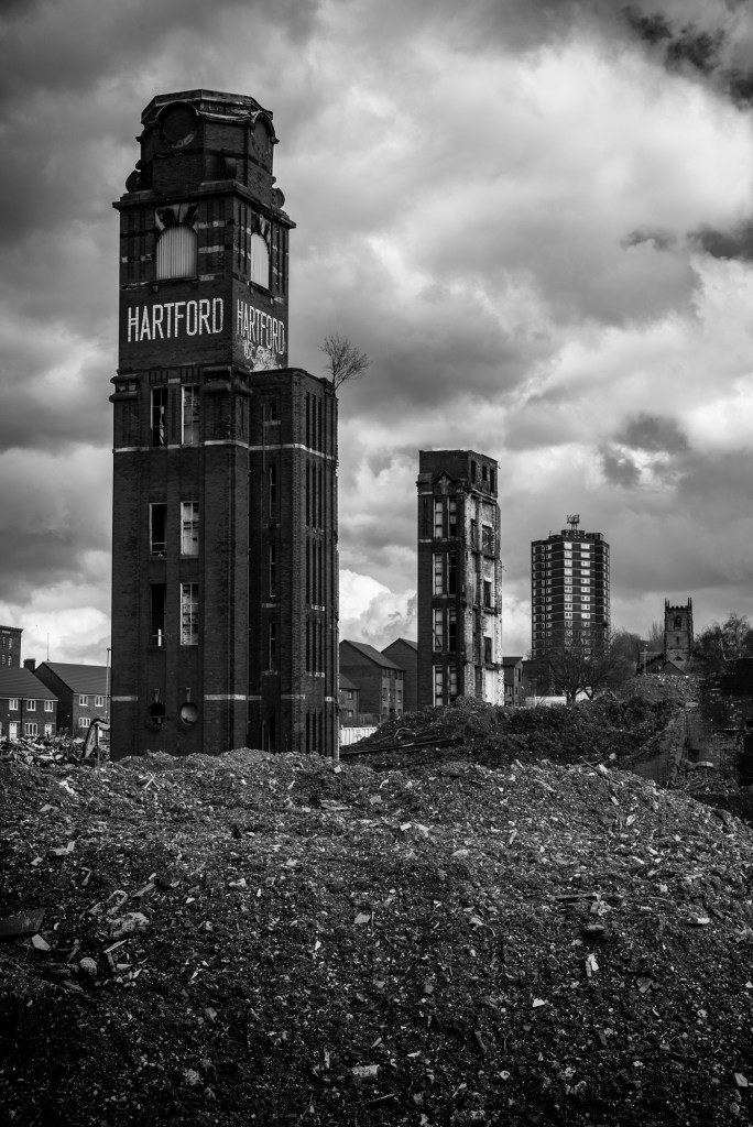 Fast forward 13 months and the scene has changed enormously. The removal of the walls of the mill has opened up the landscape and this vantage point now affords views going back to the derelict St. John’s Church in the distance. But it is the recession of the vertical structures in the scene that make the composition an interesting one, with the pile of rubble in the foreground providing a strong base for the scene.