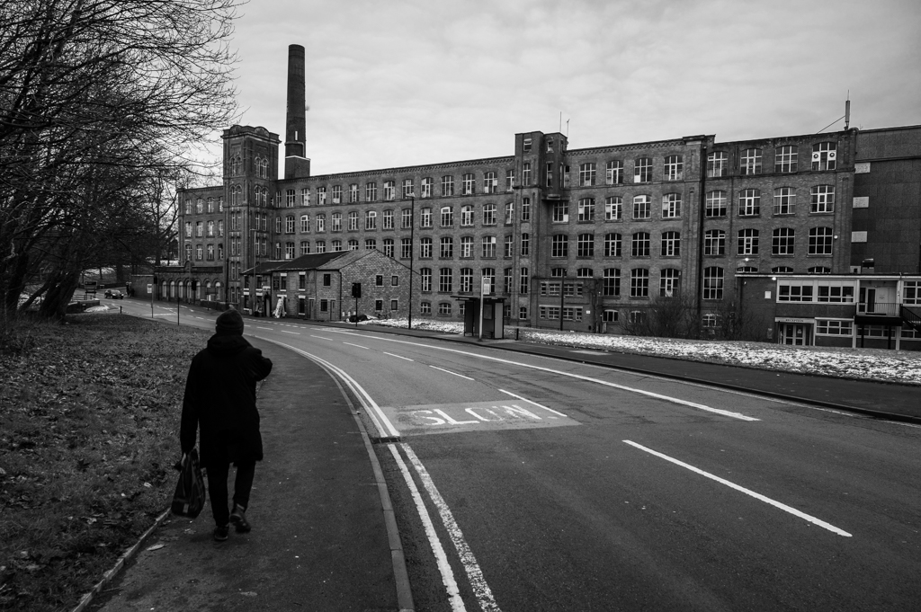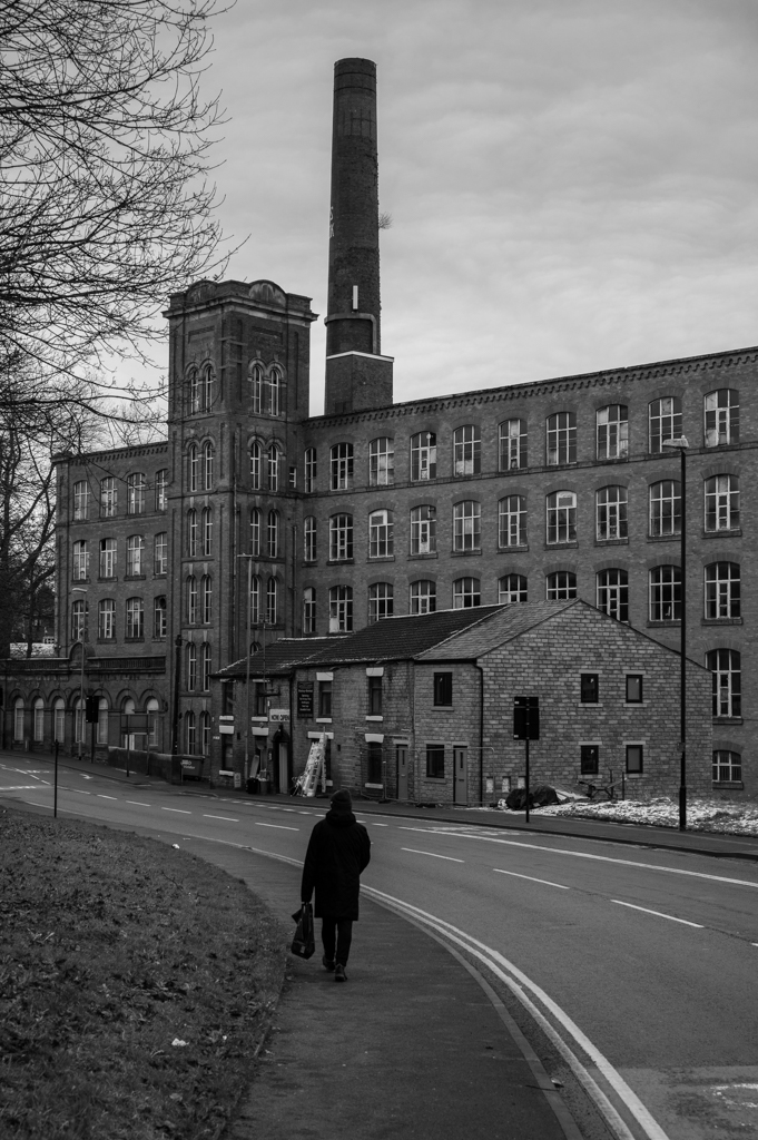 As I was composing the photograph and waiting for a lull in the traffic, a man walked past, well wrapped up against the bitter cold. I don’t know why, but he had the air of a man going somewhere, to work maybe, with his clothing and the bag he was carrying. I decided to add a different element to the record photograph by including him in the composition. His presence in the frame adds something different to the image, maybe it’s scale as the mill is unusually long but his all black attire makes him featureless and thus less of a distraction. And yet his presence on the pavement is a distraction, the photograph is no longer just about the mill. Questions are asked – where is he going – is he going to work in the mill? What’s he carrying a large bag for? Why is there no other sign of life on a main road? Why is he dressed all in black?