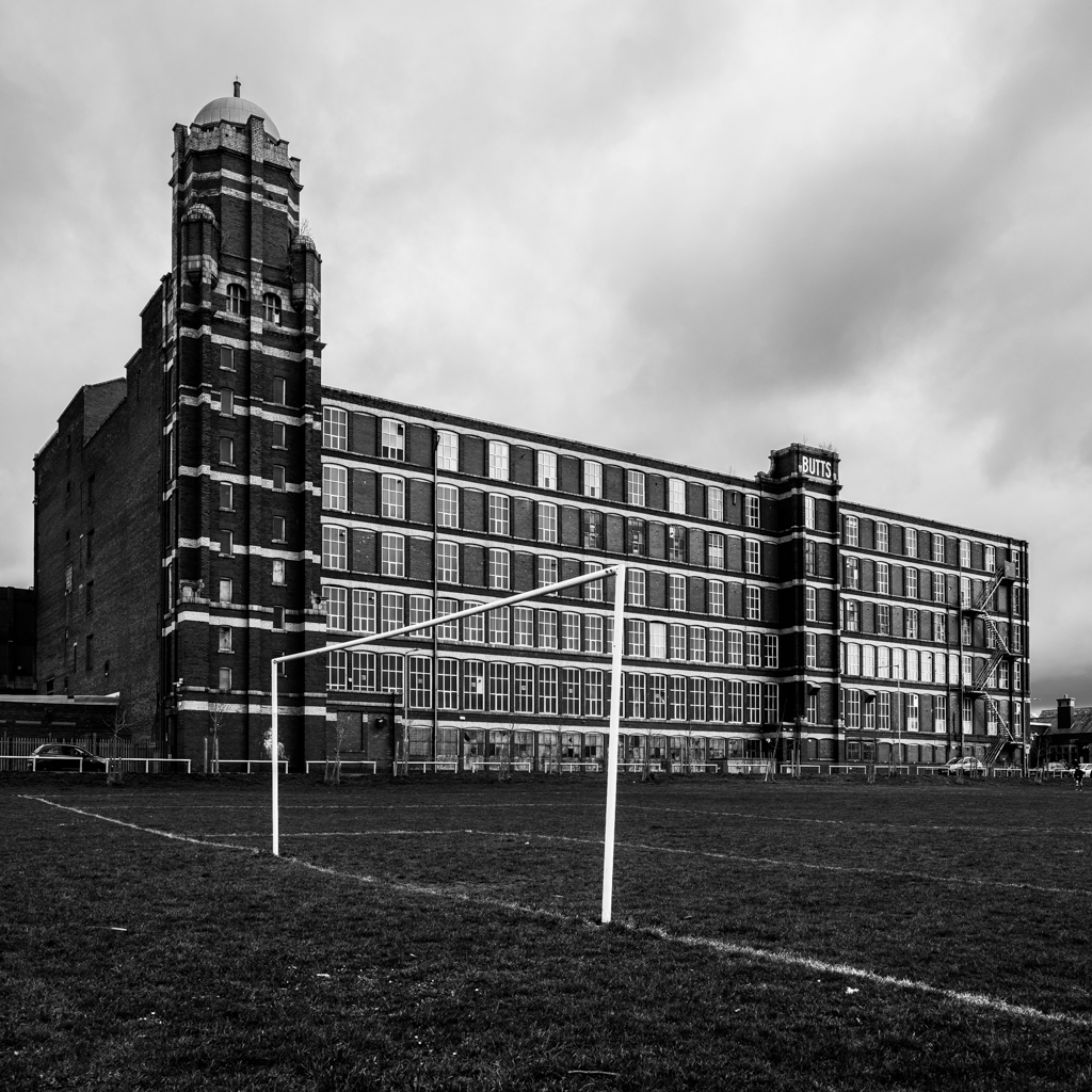 Butts Mill sits opposite Dootsons Park Playing Fields, and a game of youth football had just finished when I got there. This was a shame as it would have been nice to have got some players in the frame when I photographed the mill, but I think an empty pitch works equally well.