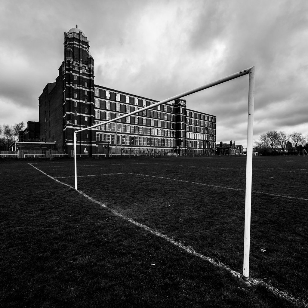 I decided to make a feature of the goal posts, but did two different versions. The one was taken at 24mm, and this shows the mill really dominating the scene, towering over the field.