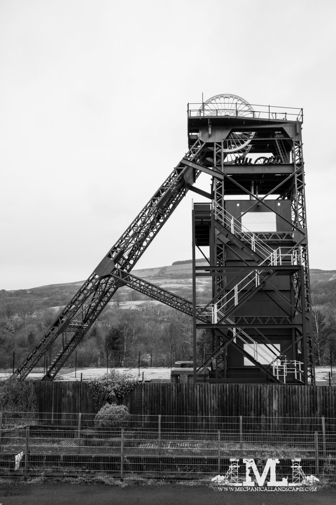 The upcast wasn’t too much of an issue, as it was close to the road and could be photographed side on from the pavement on the opposite side. This has been the most recently restored of the two at Cefn Coed and was still in pieces when I’d originally planned to visit in 2021. Since its restoration it’s had a modern staircase erected alongside, presumably to enable visitors to visit the top when at some point the museum reopens. I’ve muted the colours in the black and white conversion so it blends into the rest of the structure.