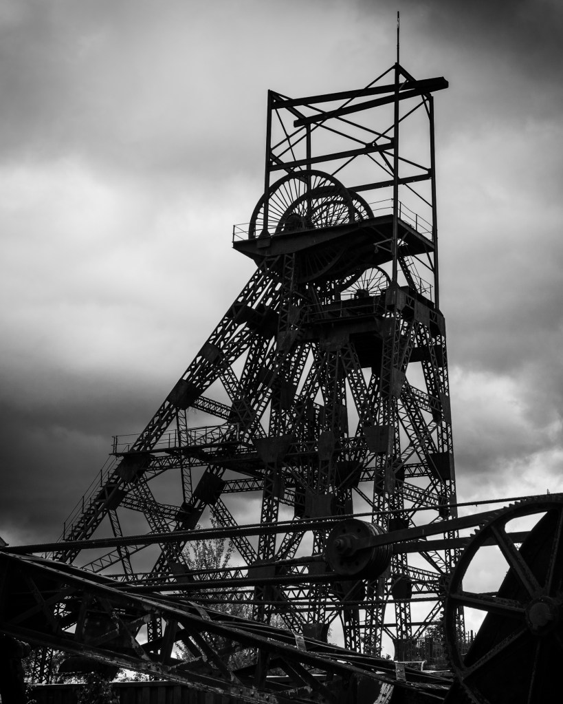 June 2024 saw a lot of changeable weather, and the day i visited alternated between sunshine and blue skies and dark clouds and rain. I’d taken a few photos of the headgear with an old railway crane in the foreground, as I liked the way the lattice structure on the boom complimented the lattice structure of the headgear, but as I stood talking to my friend Mark, I noticed the sky getting darker and darker save for a small light patch. I quickly grabbed a couple more photos (in landscape format) trying to ensure that the large gear wheel of the crane remained in the frame.